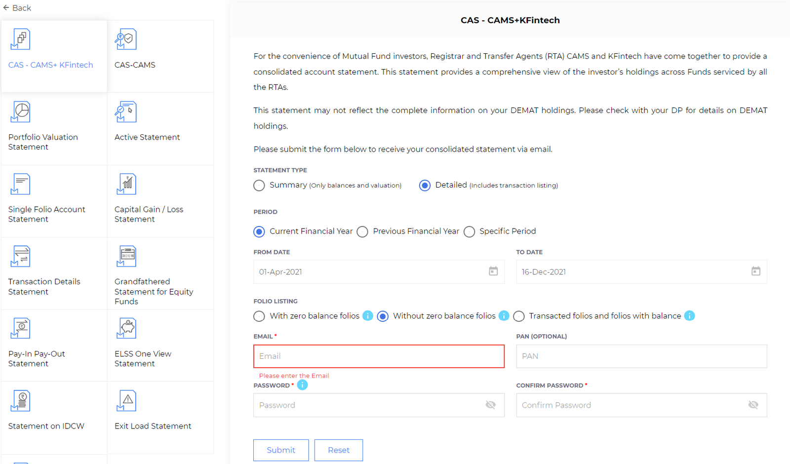 For improved security, the statement will be encrypted using the password provided by you in the form above, and emailed only to the email address registered in your folio.